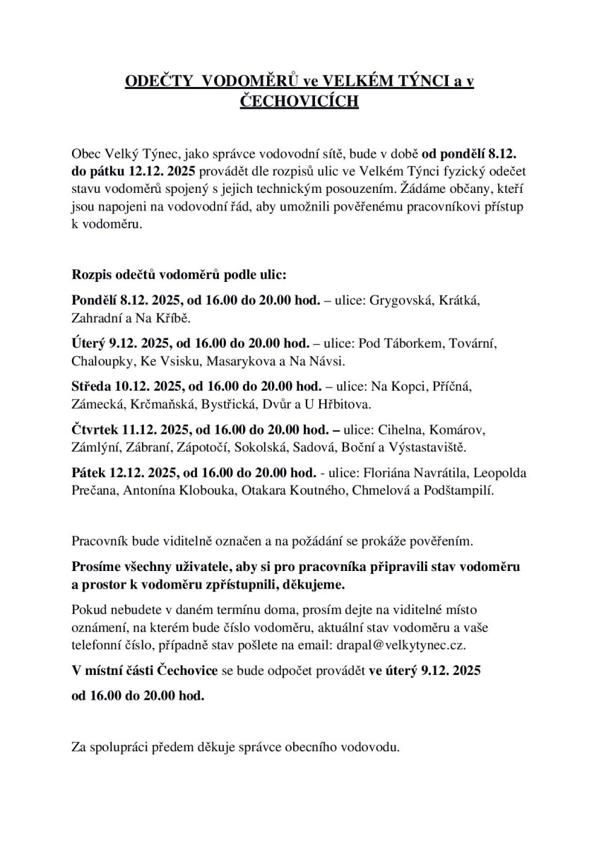 Odečet vodoměrů za období 7-12/2025 - Velký Týnec a Čechovice