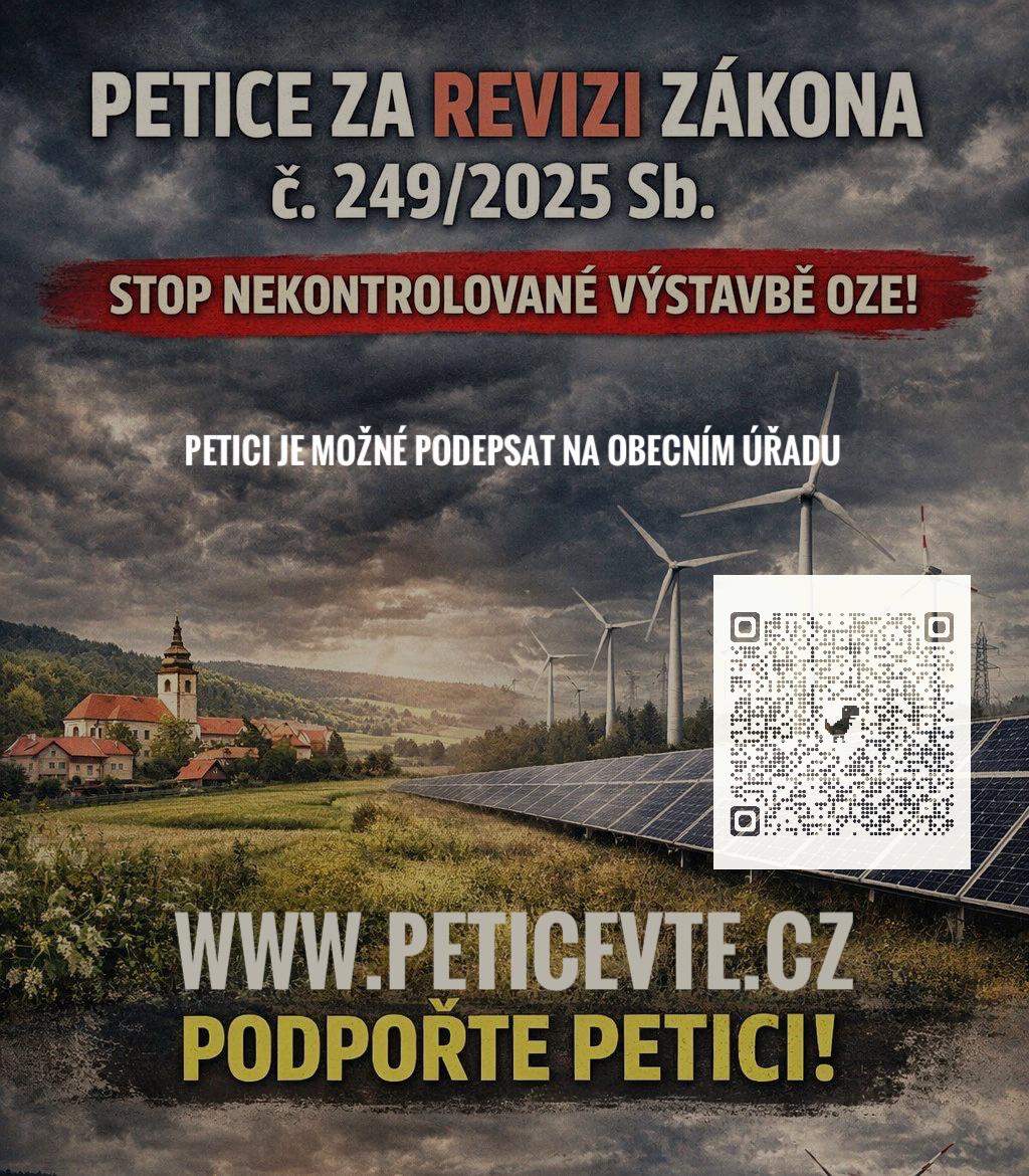 v minulém roce byly rozšířeny záměry výstavby větrných elektráren v některých obcích. Nově platná legislativa umožňuje jejich výstavbu bez ohledu na názory obcí a občanů, přičemž o povolení rozhoduje celostátní stavební úřad v Praze. Na podporu práva obcí rozhodovat o svém území vznikla celorepubliková petice adresovaná Vládě ČR. Jejím cílem je zachování respektu k územním plánům obcí a omezení rozhodování mimo místní úroveň. Petici je možné podepsat také na Obecním úřadě Velký Týnec do pondělí 9. 2. 2026.