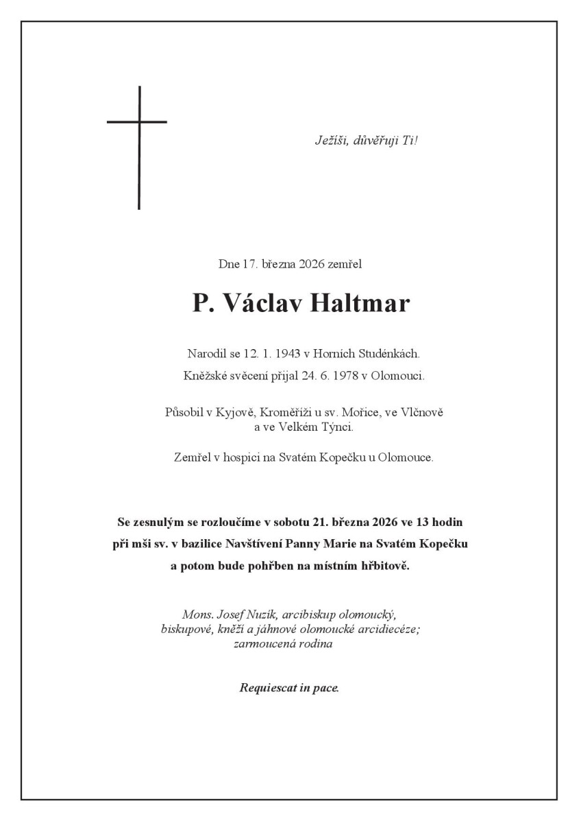 Zemřel páter Václav Haltmar, dlouholetý farář Církve římskokatolické ve Velkém Týnci