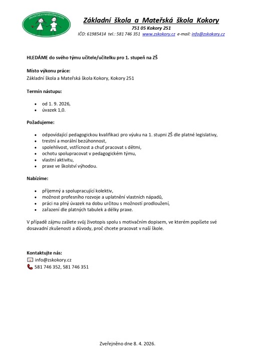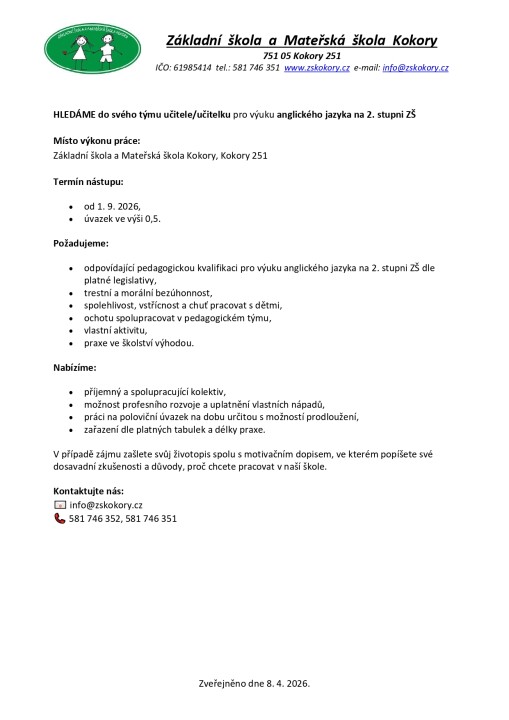 hledá učitele/učitelku pro 1.stupeň ZŠ a učitele/učitelku pro výuku anglického jazyka 2.stupně ZŠ